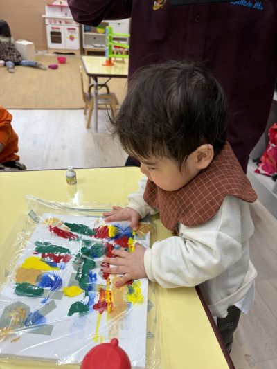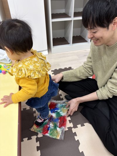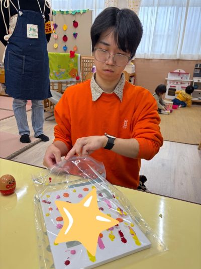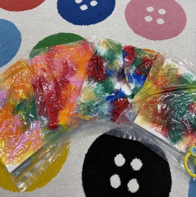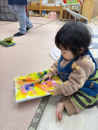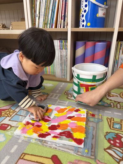 指でぎゅっぎゅっと押したり、手のひらで広げたり…。完成した作品は、どれも個性的で鮮やかな「今この瞬間」だけの宝物になりました!