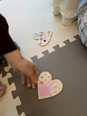 最後はハート型の板に手型や足型をとって、