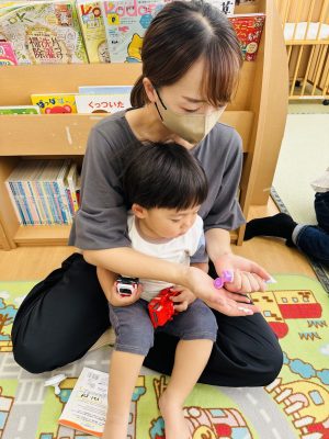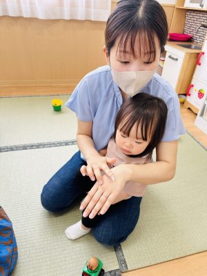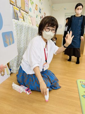 塗り薬の量も実際に実演しながら見せてもらい、お母さん達の手のひらに実際塗ってもらい体験してもらいました。