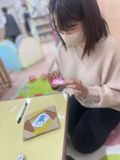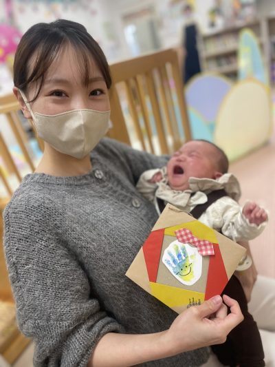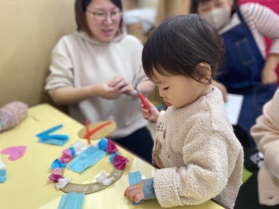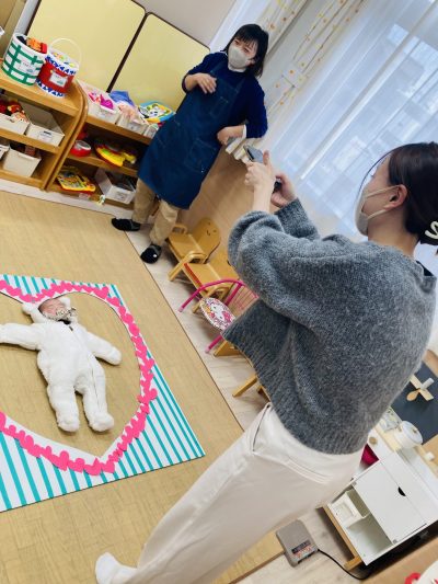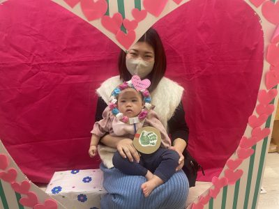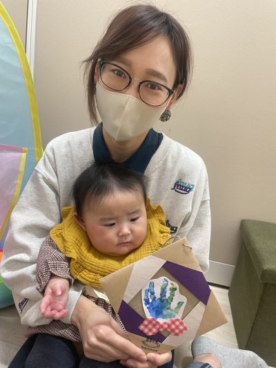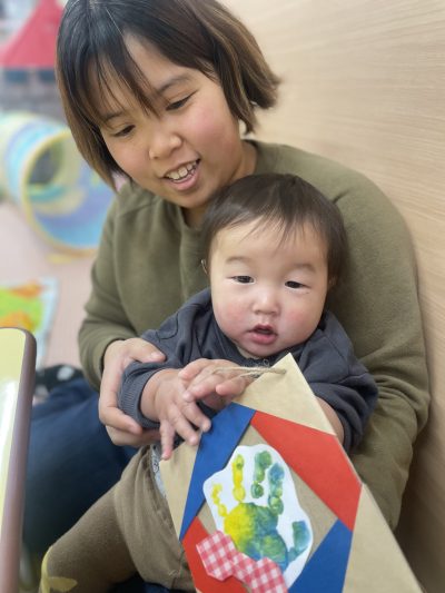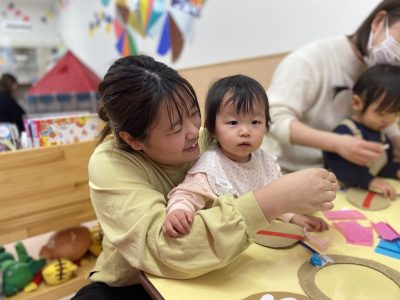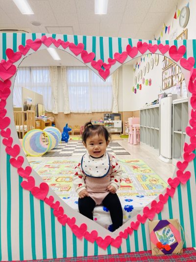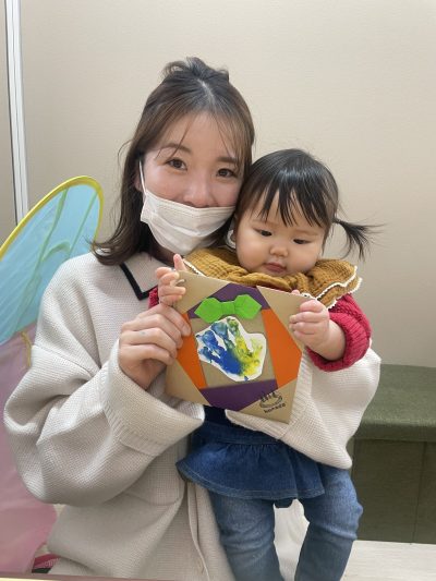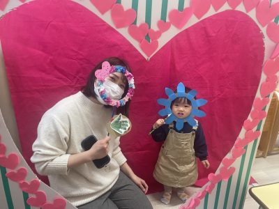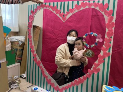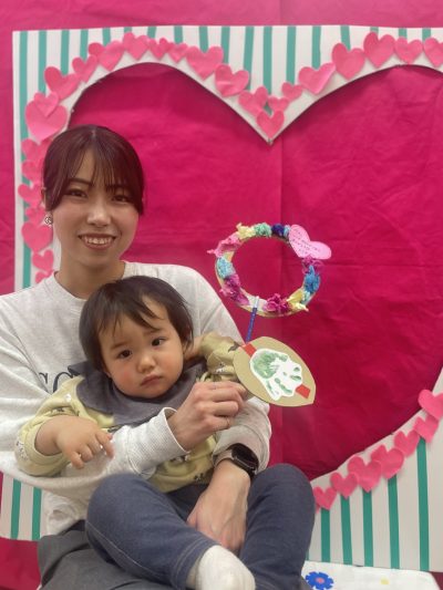 komodoスタッフによる「手遊び&ふれあい遊び」、お子さんのかわいい手形を使った「バレンタインクラフト」をしました♪