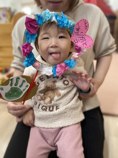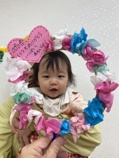 0歳児さんには『手形入りのメッセージフレーム💗』1歳児さんには『お花のフォトプロップス』をママと一緒に作りました♪