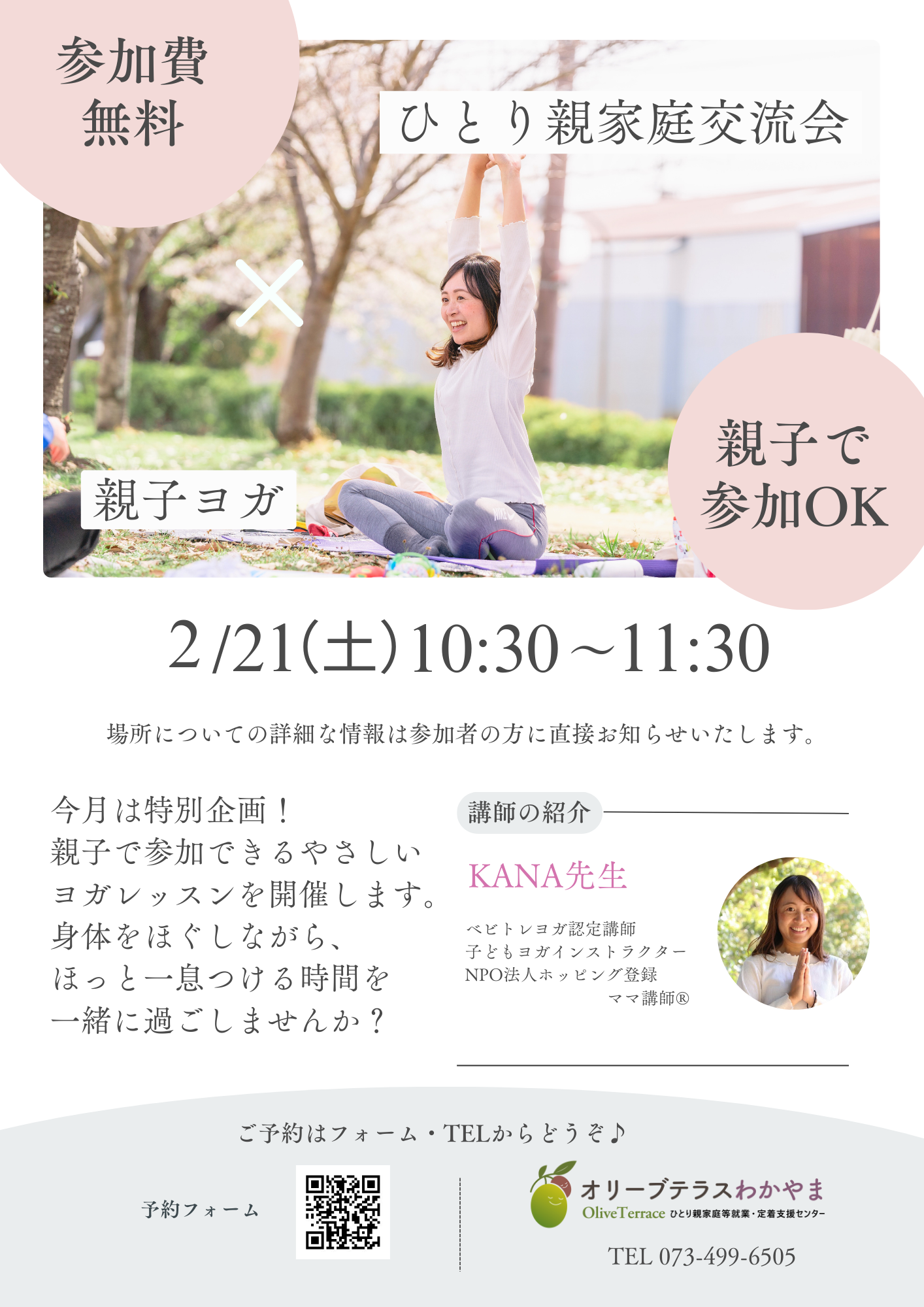 EVENT イベント ホーム イベント ひとり親家庭交流会 親子ヨガ 2026.02.21 ママ講師®によるイベント ひとり親家庭交流会 親子ヨガ 開催日 2026年02月21日 開催時間 10:30~11:30 開催場所 お申込み頂いた方へお知らせします 対象者 シングルマザー・シングルファザーの方々(離婚前の方も含みます) 参加費 無料 お申し込み Share Tweet リンクをコピー リンクをコピーしました 一覧に戻る