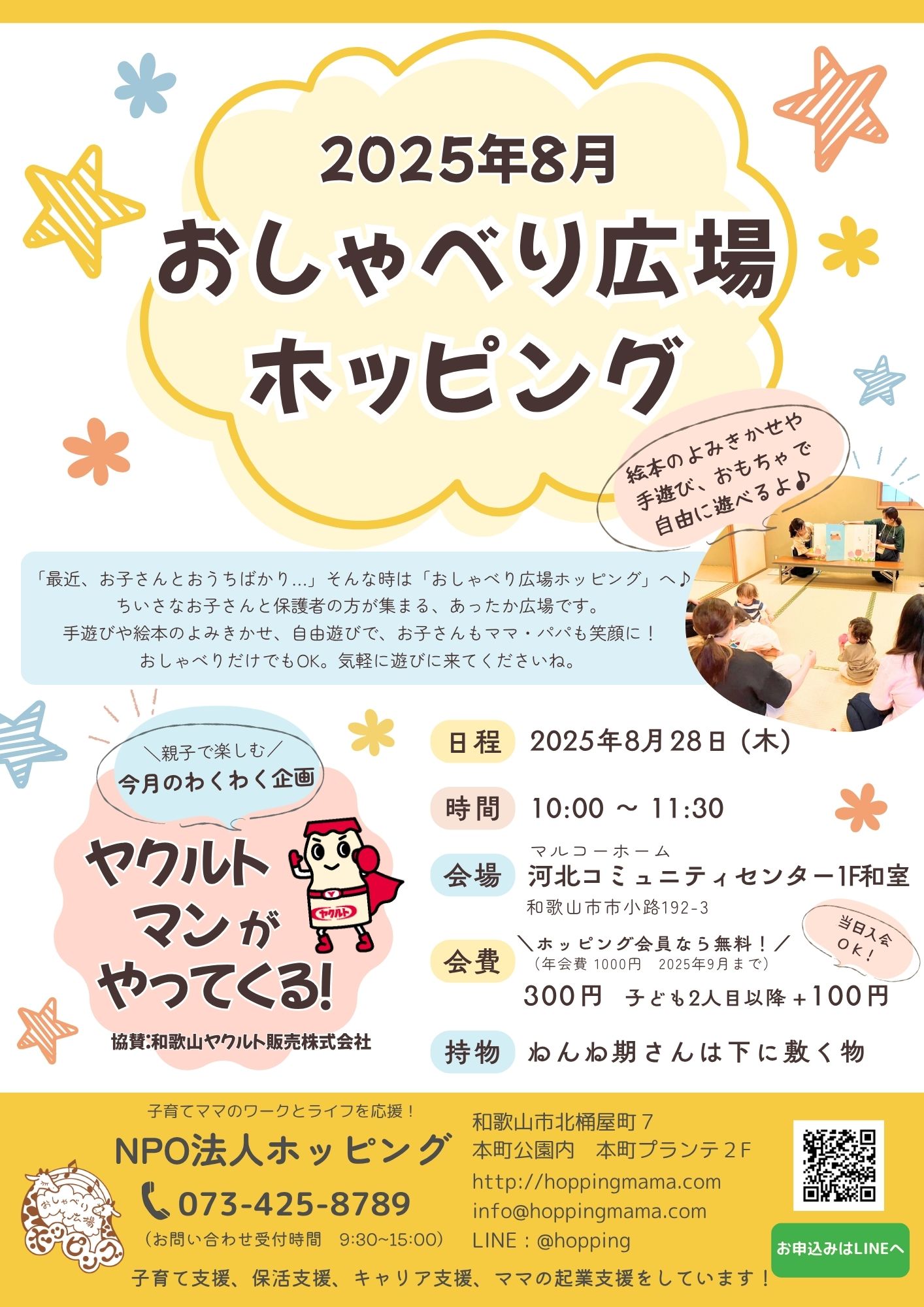| 備考 | 参加希望の方はLINEホッピング公式アカウントに ・8/28おしゃべり広場ホッピング参加希望 ・保護者のお名前(ふりがな)、お子さまのお名前(ふりがな) ・お子様の月齢 ・お電話番号 を記入しメッセージを送信してください。 LINE:@hopping |