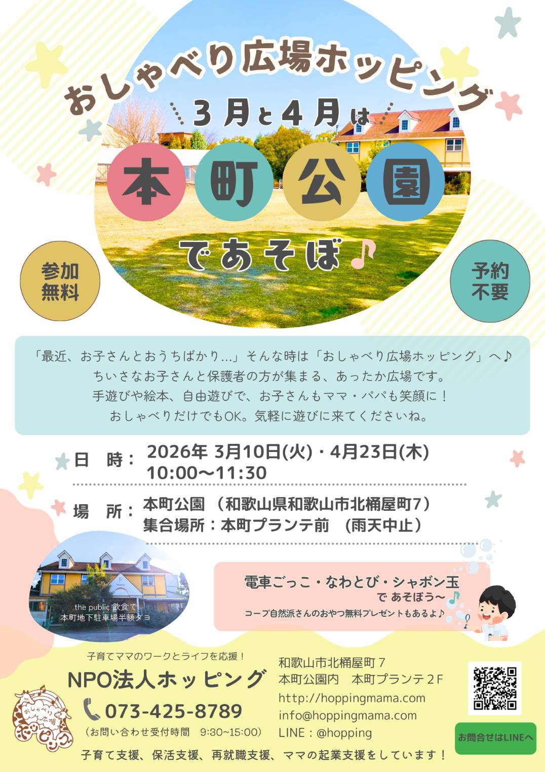 EVENT イベント ホーム イベント 3月★おしゃべり広場ホッピング 2026.03.10 ホッピングイベント 3月★おしゃべり広場ホッピング 開催日 2026年03月10日 開催時間 10:00~11:30 開催場所 本町公園 (集合場所:本町プランテ前)(雨天の場合は中止となります) 対象者 未就園児とその保護者 参加費 無料 定員 なし 備考 予約不要です♪ 芝生なので敷物もってきてくださいね★ コープ自然派さんのおやつプレゼントもあるよ! (雨天の場合は中止となります) Share Tweet リンクをコピー リンクをコピーしました 一覧に戻る