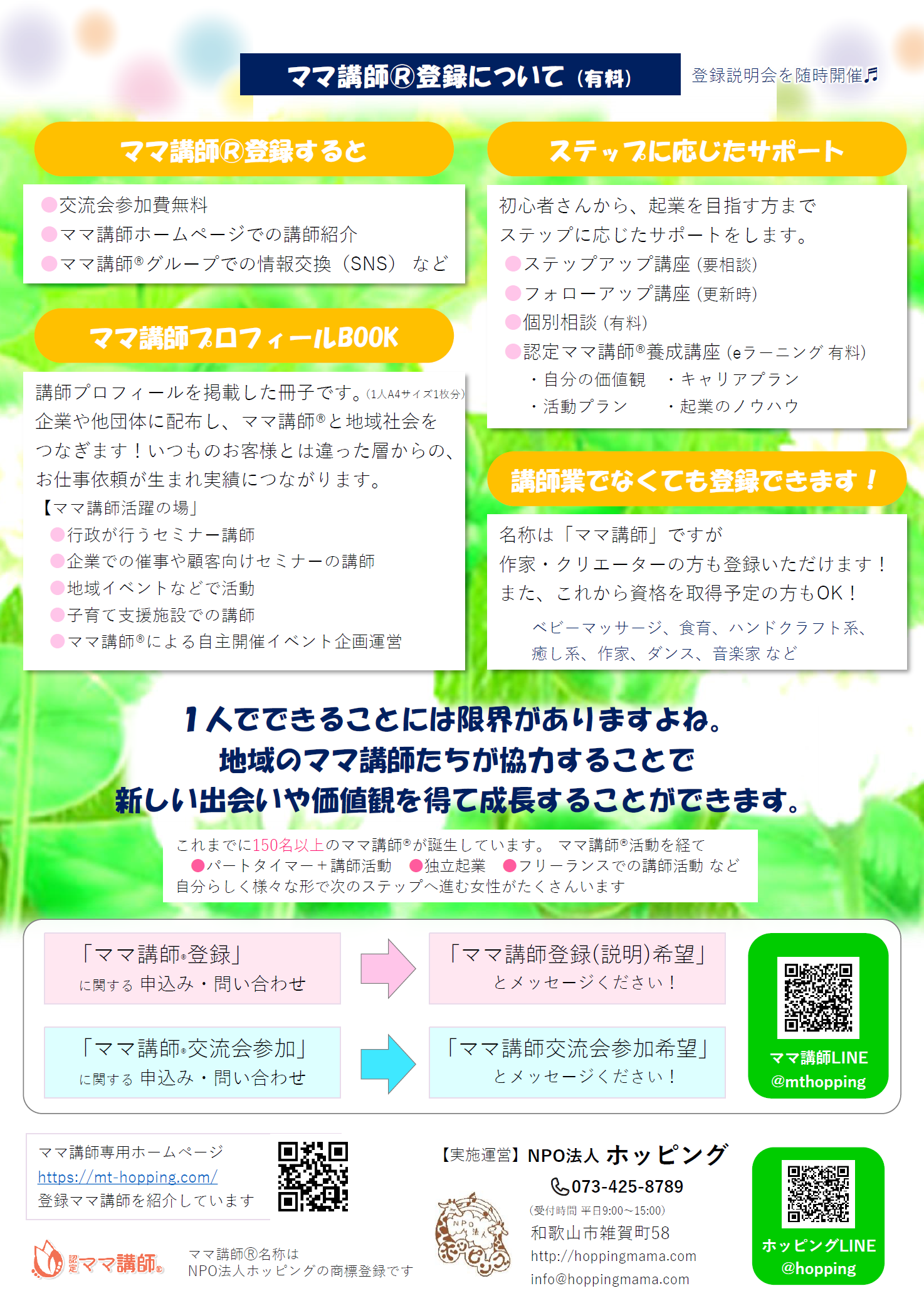ママ講師ⓇはNPO法人ホッピングの商標登録です。 [商標登録番号 第6115228号] ママ講師Ⓡ名称を無断使用は商標権侵害行為となり法律で罰せられます。 |